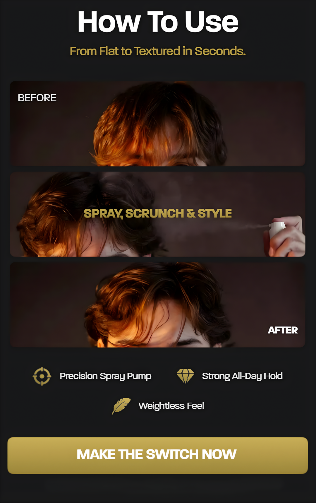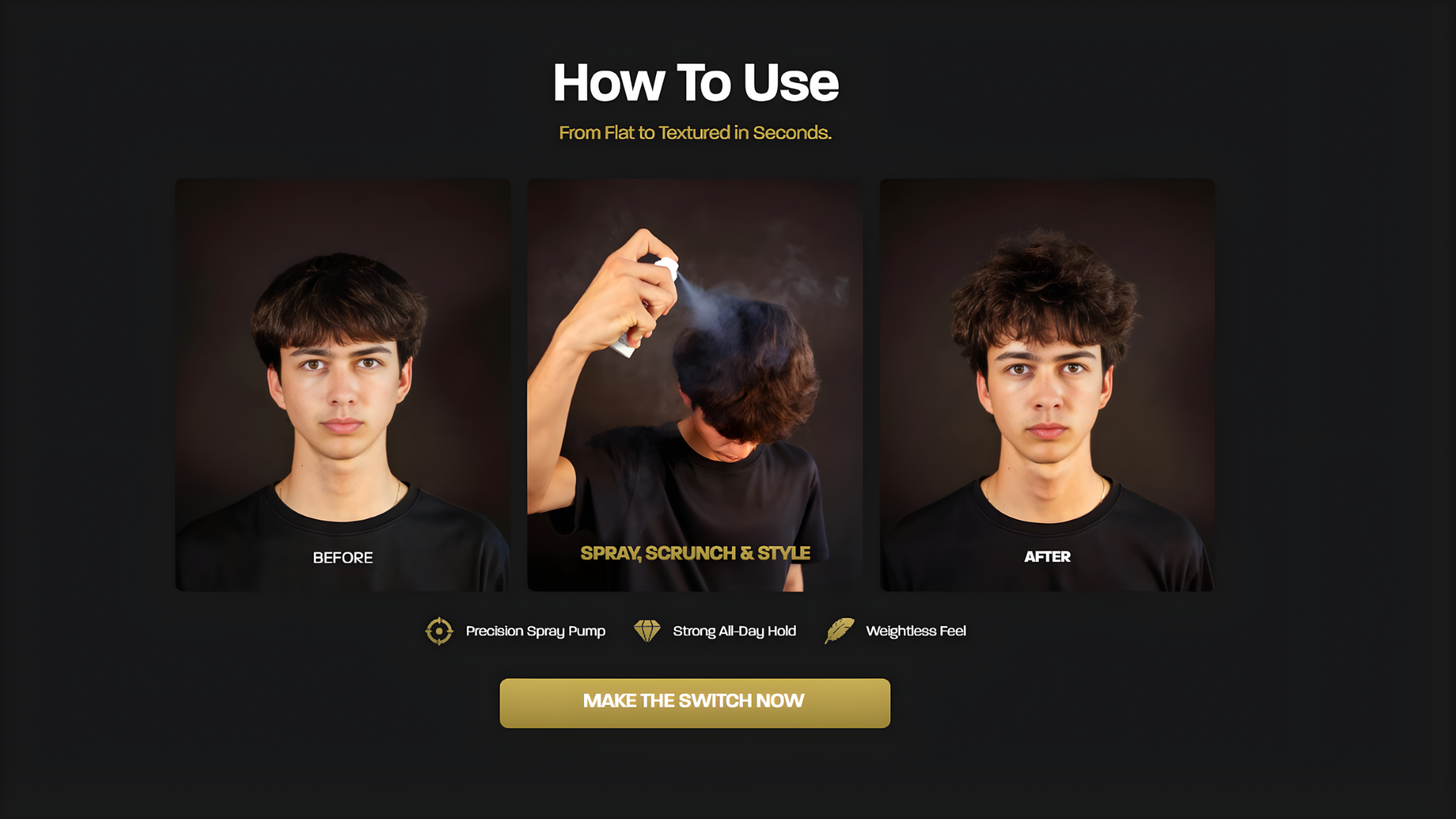 Simple. Spray it 2-4 times, scrunch it into your roots to activate, then style it exactly how you want. Amount of sprays will vary on your hair length and thickness.